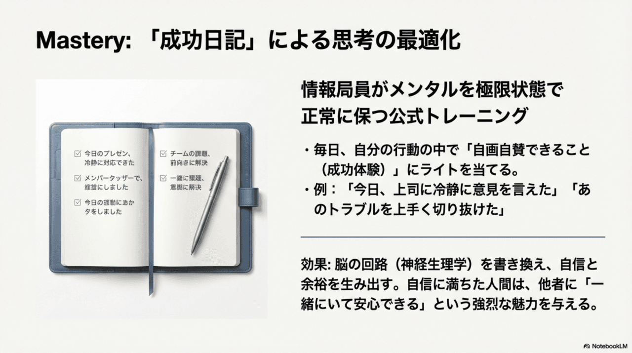 揺るぎないパーソナリティを確立し、カリスマ性を発揮するためには、自己の脳内システムを再構築(リプログラミング)する必要があります。そこで推奨されるのが「成功日誌」の習慣です。