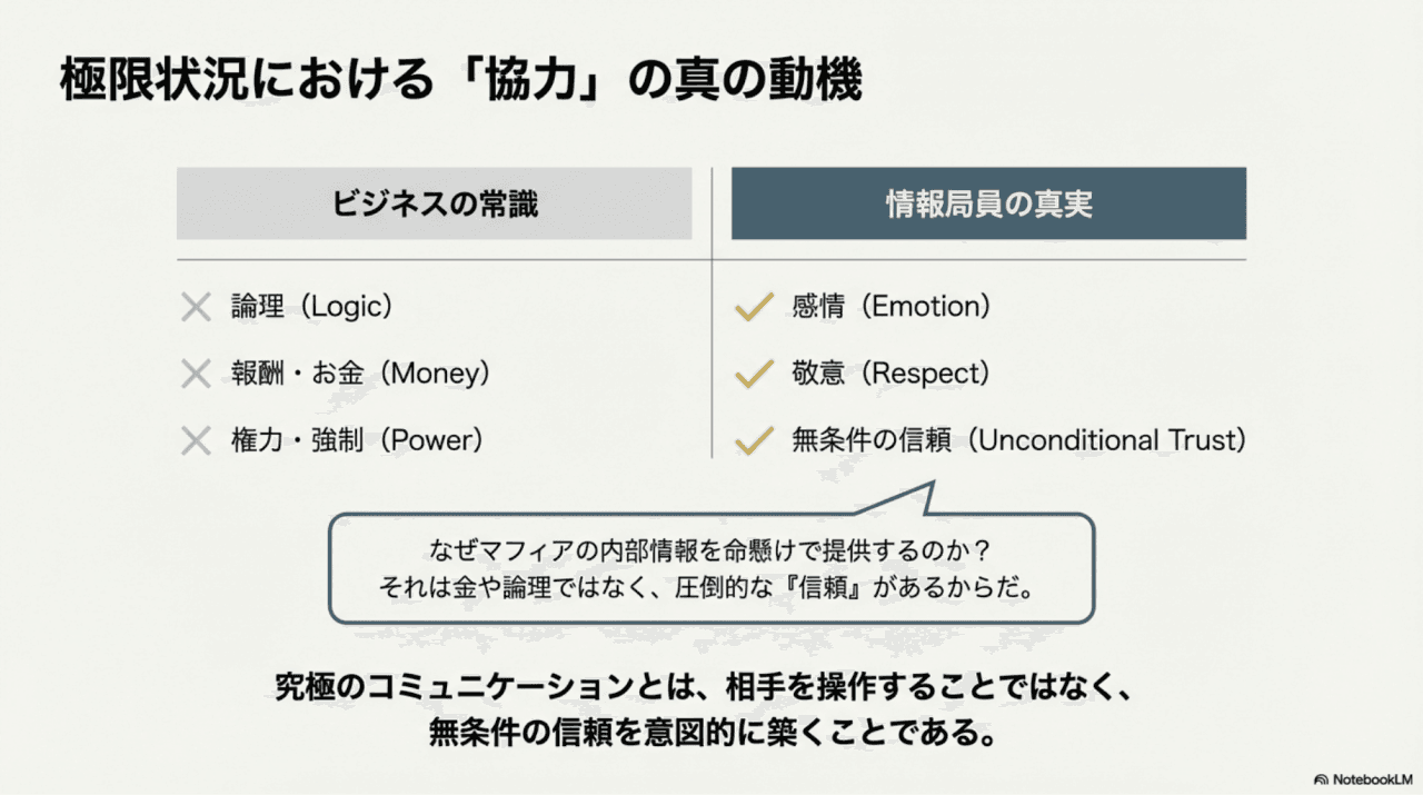 インテリジェンスの本質とは、「人は組織や理念のためではなく、自分を尊重してくれる個人のために動く」という冷徹かつ温かな真理に帰結します。優れた諜報員は、国家という巨大な装置の部品としてではなく、ターゲットにとっての「唯一無二の理解者」として振る舞うことで、不可能を可能に変えてきました。