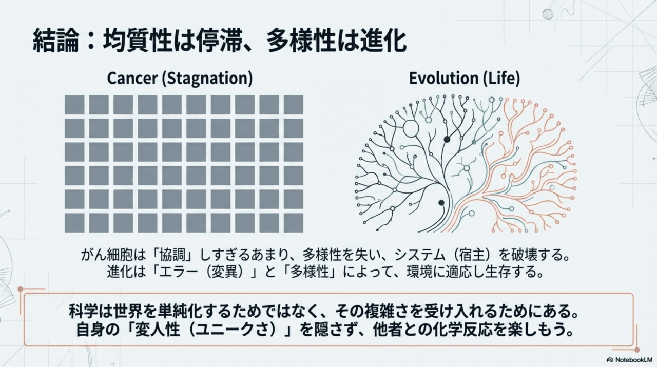 人間は同調圧力によって個性を隠そうとしますが、タンパク質はエゴや嫉妬とは無縁で、それぞれの個性を最大限に活かして協力します。人間が学ぶべきは、この「違いを抑圧するのではなく、最大限に活用する」モデルではないでしょうか。最高のチームは、均一な集団ではなく、多様な個性がそれぞれの役割を果たすことで生まれるのです。