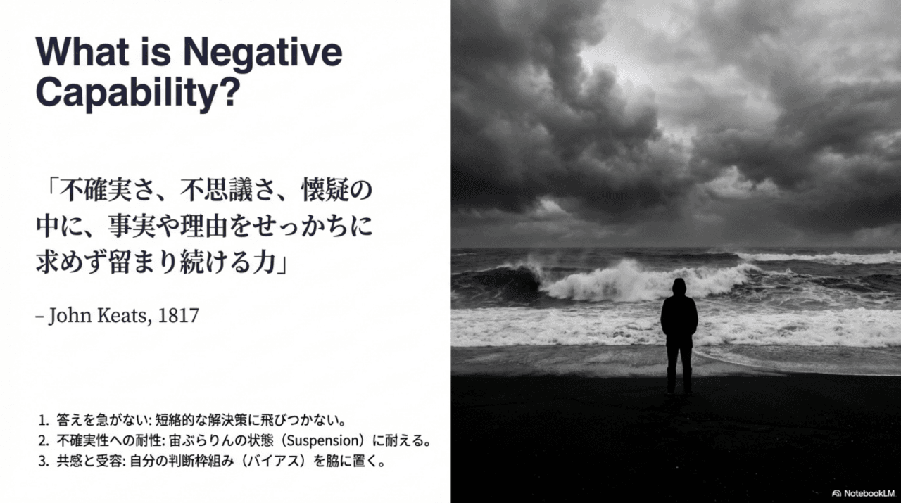 ネガティブ・ケイパビリティは、不確実な時代を生き抜くための、静かで、しかし極めて力強いスキルです。それは性急な答えや効率性ばかりがもてはやされる現代社会への、ささやかで本質的な抵抗ともいえるかもしれません。