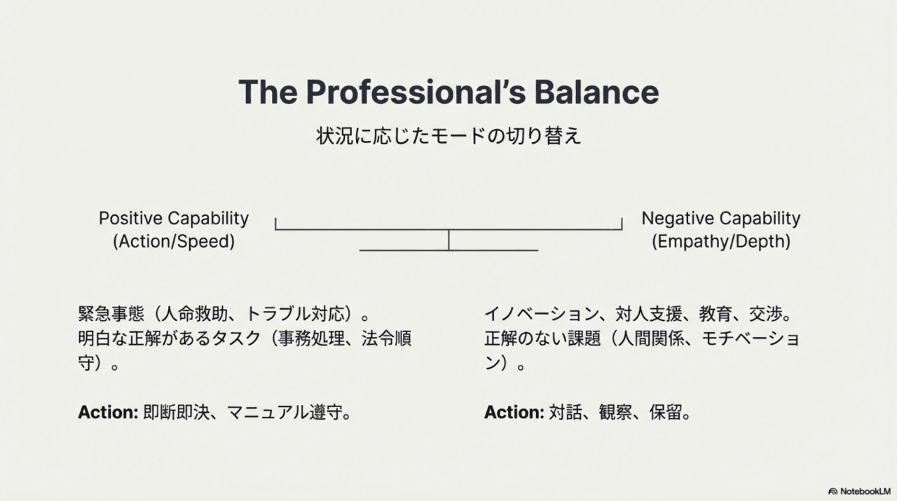 効率的に答えを出すべき場面ではポジティブ・ケイパビリティを、複雑で答えのない問題に直面したときにはネガティブ・ケイパビリティを発揮し、じっくりと思考を深める。